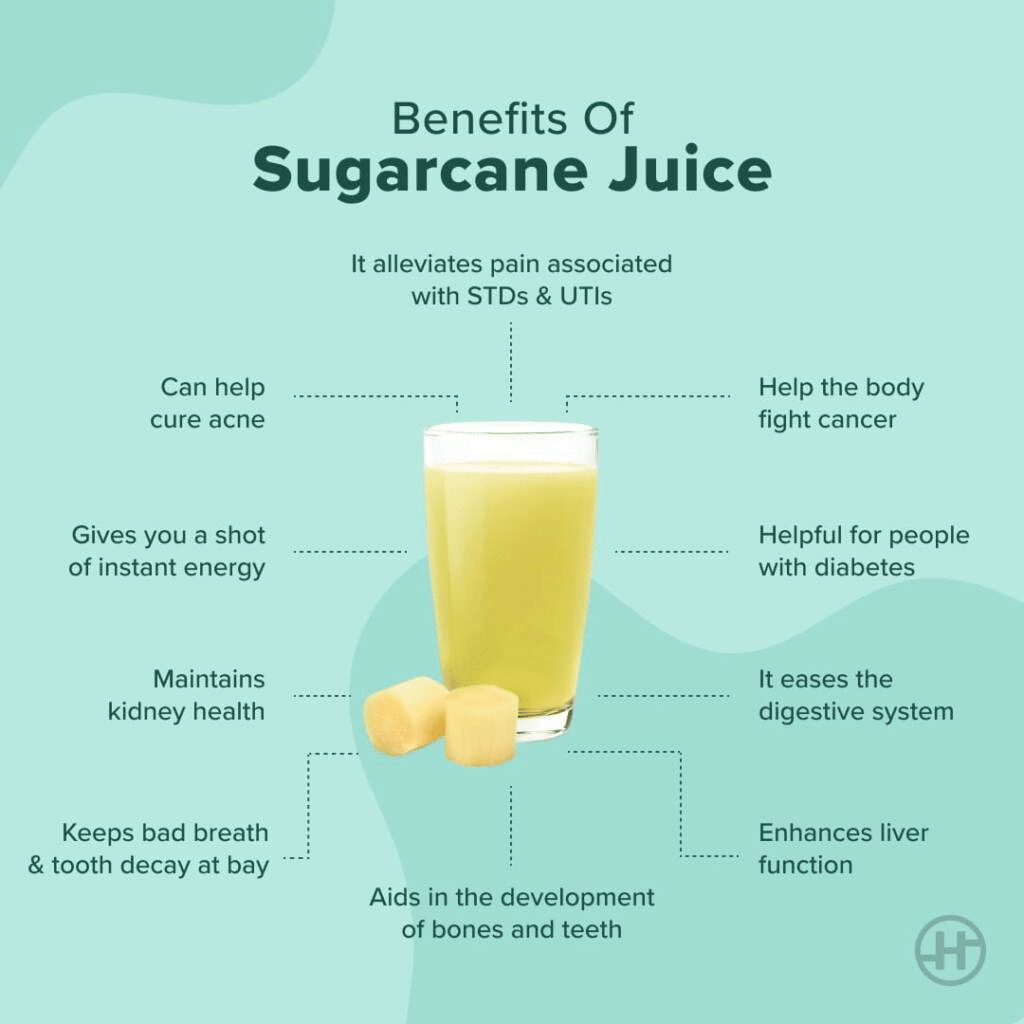 The potassium in sugarcane juice balances the pH levels in the stomach. Drinking sugarcane juice also keeps one hydrated and helps with regular bowel movements. It also helps prevent stomach infections.