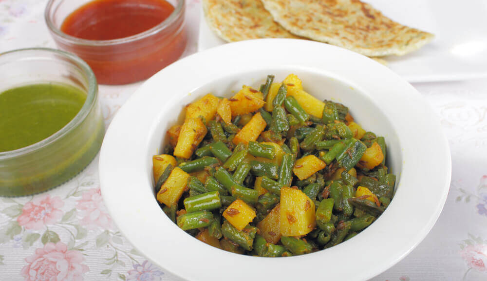 Aloo Beans is a popular Indian dish made with potatoes, green beans, and spices. It is a simple and flavorful dish that can be served as a side dish. The potatoes are cooked until they are soft and then combined with the green beans and spices. The dish is usually served with chapati or rice.