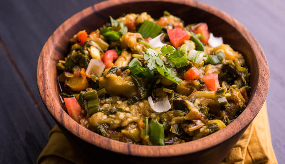 Baigan Ka bharta is a vegetarian dish from the Indian subcontinent. It is a spicy dish made with mashed eggplant (baigan) and is usually served with roti or parantha. The eggplant is cooked with onions, tomatoes, garlic, ginger, and a variety of spices. It is often garnished with fresh cilantro and served with a dollop of ghee or butter.