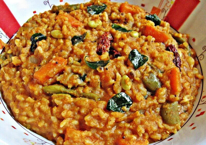 Bisi Bele Bhaat is a popular dish from the South Indian state of Karnataka. It is a spicy rice dish made with lentils, vegetables, and spices. The dish is usually served with a dollop of ghee (clarified butter) and a side of papadum or fried kara boondi(chickpea balls). Bisi Bele Bhaat is a popular dish for special occasions and festivals. It is also a popular lunch dish in many parts of Karnataka.