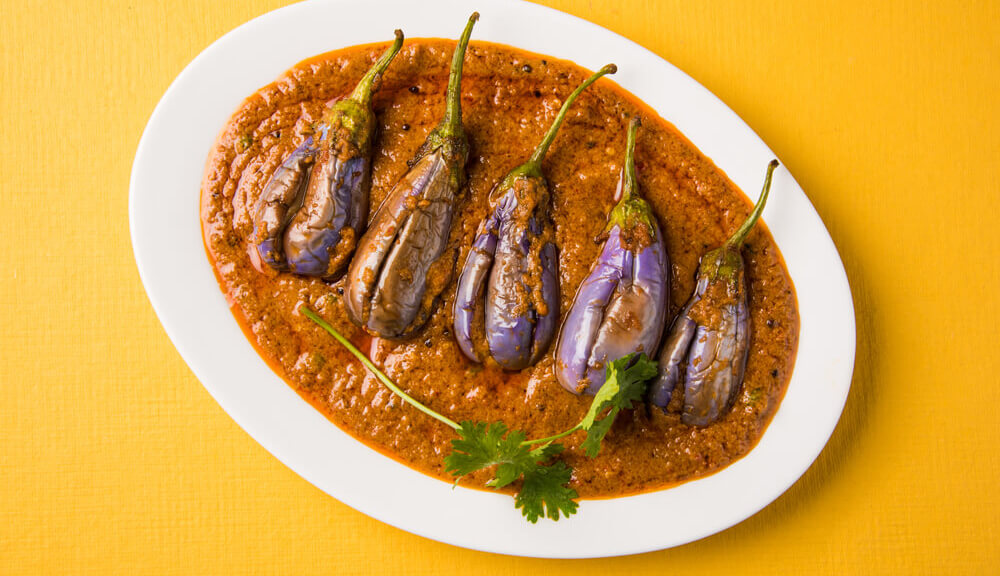Brinjal Gravy is a popular Indian curry made with eggplant. It is usually served with rice or roti. The eggplant is cooked in a spicy gravy made with onions, tomatoes, and a variety of spices. The gravy can be made mild or spicy depending on personal preference. The preparation may differ from region to region with addition or different ingredients such as peanuts, sesame seeds, coconut, tamarind, ginger, garlic or jaggery.