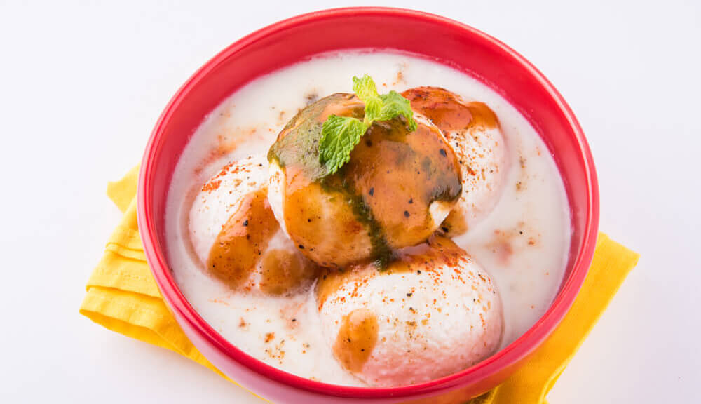 Dahi Bada is a popular Indian snack made from deep-fried lentil dumplings soaked in a spiced yogurt sauce. The dumplings are usually made from a mixture of urad dal (split black gram) and mung dal (split green gram) that is soaked and ground into a paste and then shaped into small balls and fried. The fried balls are soaked in water, squeezed and then added to beaten yogurt. The yogurt is usually flavored with cumin, ginger, chili powder, and other spices. Dahi Bada is often served as a snack or appetizer, but it can also be served as a side dish or as part of a larger meal.