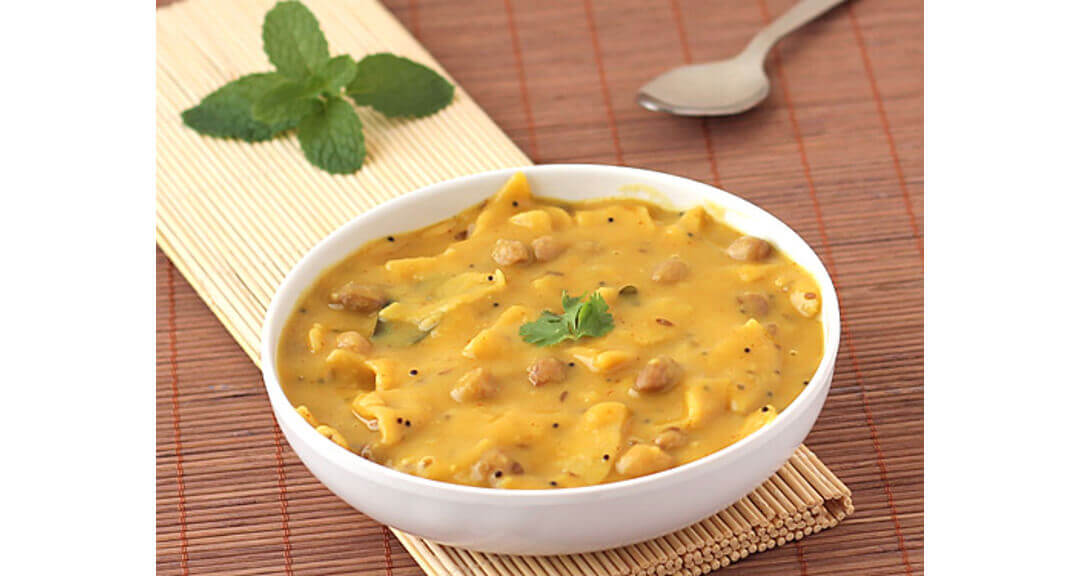 Dal Dhokli is a traditional Gujarati dish made with a combination of wheat flour dumplings cooked in a lentil curry. It is a hearty and comforting one meal dish. Pigoen peas is the most common lentil used for this. It is usually eaten for lunch or dinner and provides all the amino acids that we need.