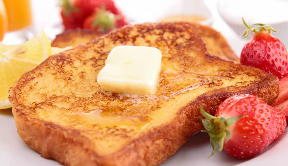 French Toast is a popular breakfast dish made from bread that is soaked in a mixture of eggs, milk, and spices, then cooked in butter. It is usually served with maple syrup and/or powdered sugar. French Toast can also be served with fresh fruit, jam, or other toppings.