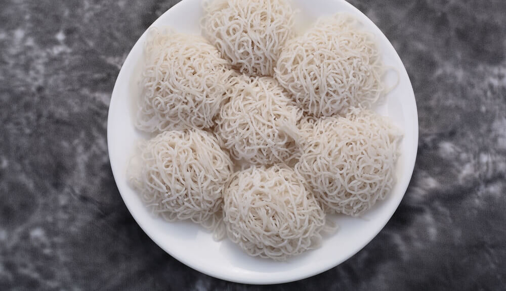 Idiyappam is a traditional South Indian dish made from rice flour. It is also known as string hoppers or noolappam. It is made by steaming a dough made from rice flour, salt, and water. The dough is then pressed through a special mould to form thin strands of dough which are then steamed. Idiyappam is usually served with a spicy coconut-based curry or stew. It can also be served with sweetened coconut milk or jaggery.