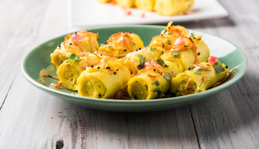 Khandvi is a savory snack from the Indian subcontinent. It is made from a batter of gram flour, yogurt, and spices, and is steamed and then rolled into thin spirals, followed by a tempering with mustard seeds. It is usually served with a chutney made from coriander, coconut, and chili peppers. Khandvi is easy to digest and a good source of protein.