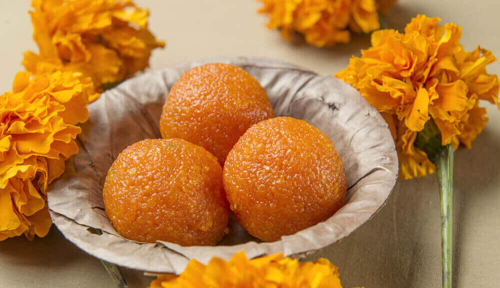 Motichoor Laddoo is a popular Indian sweet made with chickpea flour, sugar, and ghee. The batter is dropped into hot oil in small droplets, which are then fried until golden brown. The fried boondi is then mixed with sugar syrup and ghee, and shaped into round laddoos. The laddoos are then garnished with nuts and dried fruits. Motichoor Laddoo is a popular sweet served during festivals and special occasions.