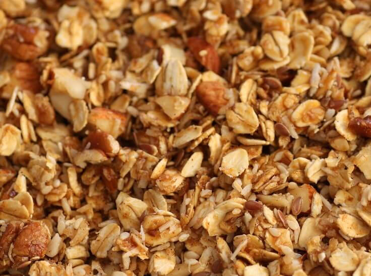In a large bowl, combine oats, almonds, walnuts, pumpkin seeds, sunflower seeds, and dried cranberries.
