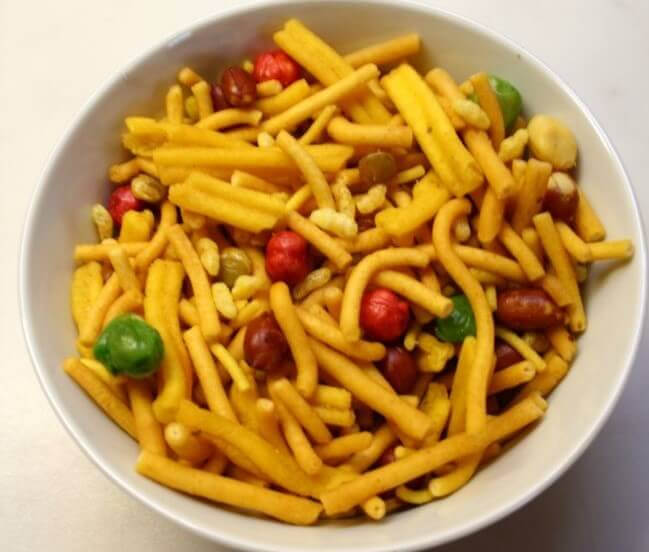 Namkeen Mixture is a popular Indian snack made from a variety of ingredients such as fried lentils, peanuts, chickpeas, and spices. It is usually served as an accompaniment to evening tea or coffee. The ingredients used in the mixture vary from region to region but often gram flour as a common ingredient. Namkeen can also be added in chaats such as bhelpuri or as a topping for a famous street food made from sprouts called as misal. Baked namkeens are also getting popular as they are lower in fat and better for those who are watching their weight.