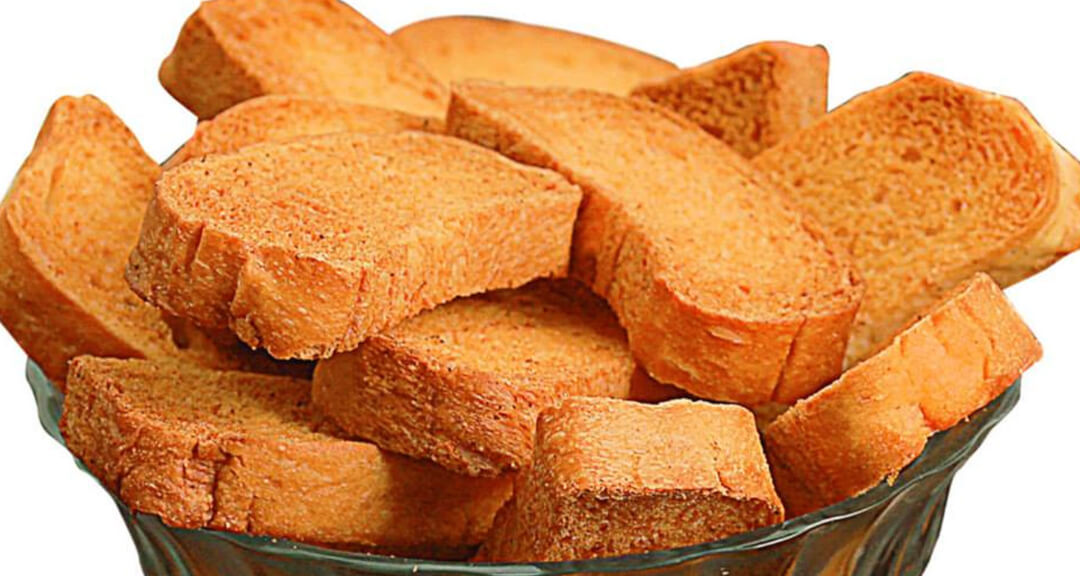 Rusk is a type of hard, dry biscuit or twice-baked bread. It is sometimes referred to as a "biscuit rusk" or "tea biscuit". It is made by cutting a loaf of bread into slices, then baking or drying them until they become hard and crisp. Rusks are often served with tea or coffee, and can be used to make pudding or a quick shahi tukda. Cardamom flavoured rusks are popular in India.
