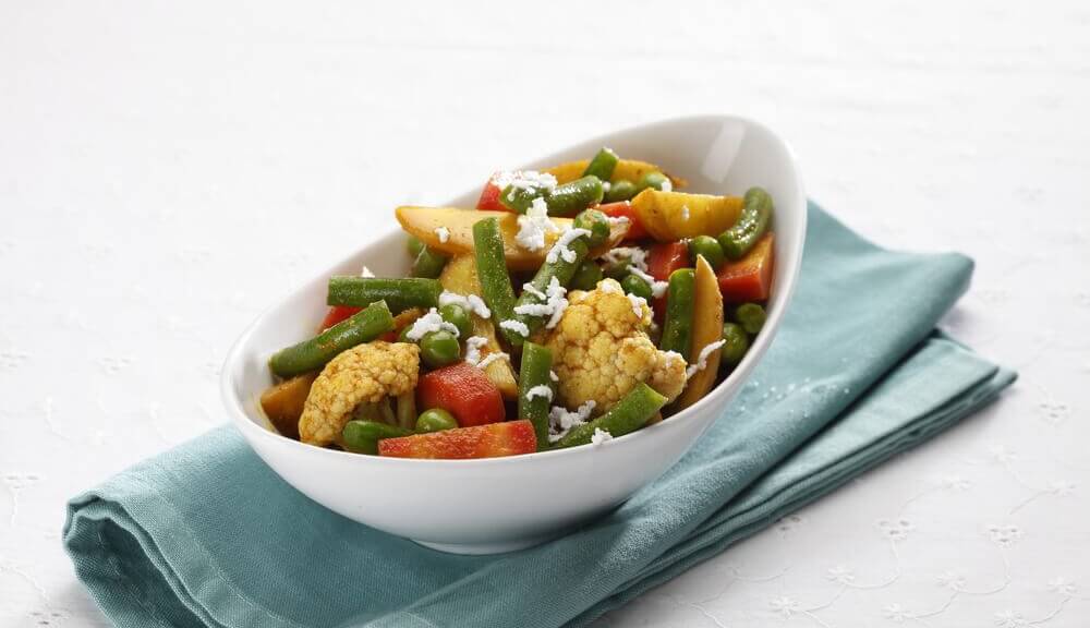 Add the tomatoes, potatoes, carrots, green peas and mixed vegetables and fry for a few minutes.